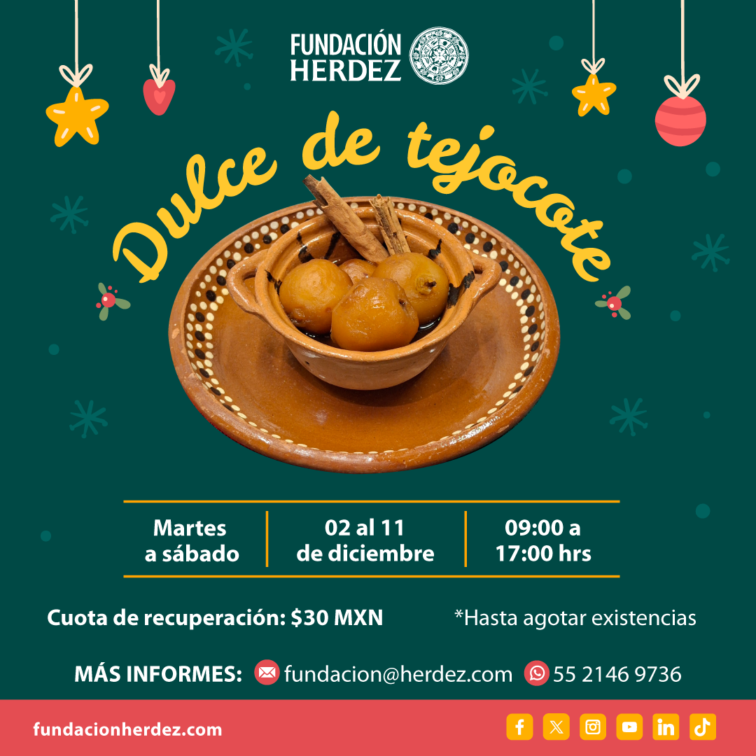 Degustación Dulce de tejocote Dulce de tejocoteCuota de recuperación $30 mxnMartes a sábado a partir de las 09:00 hrshasta el 11 de diciembre ¡Te esperamos! + Añadir Google Calendar Exportación + iCal / Outlook Fecha Dic 11 2025 Finalizdo! Hora 09:00 - 17:00 Localización Fundación Herdez Categoría DEGUSTACIÓN Organizador Fundación Herdez Compartir este evento