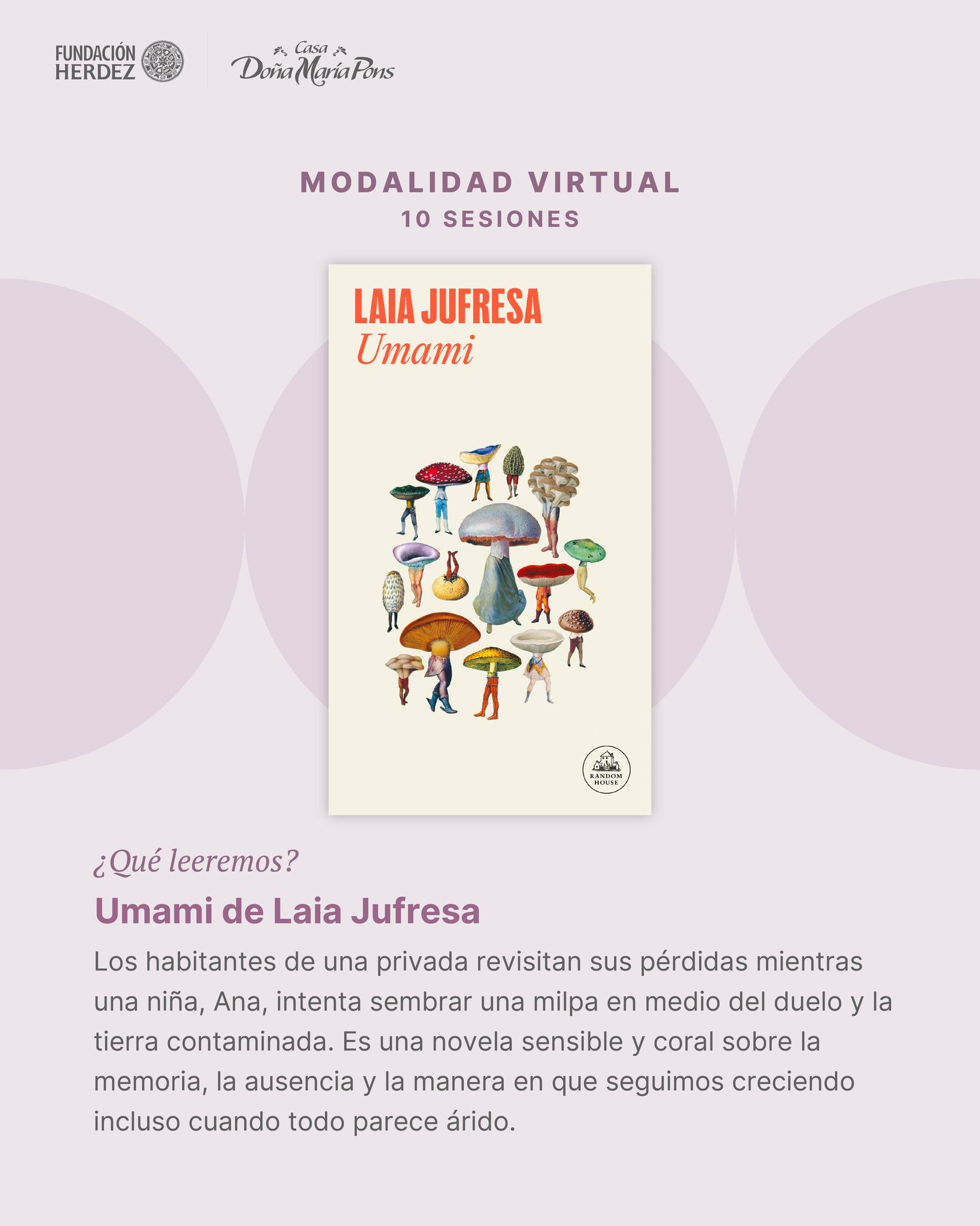 Primera novela de la autora, publicada en 2015 y traducida a nueve idiomas. Una obra coral narrada por cinco voces —Ana, Marina, Alfonso, Luz y Pina— que habitan la Privada Campanario en los años 2000 en la Ciudad de México. En Umami, la comida no es un accesorio: es ausencia, duelo, memoria y reconstrucción. El sabor se convierte en metáfora de lo que permanece y de lo que falta.