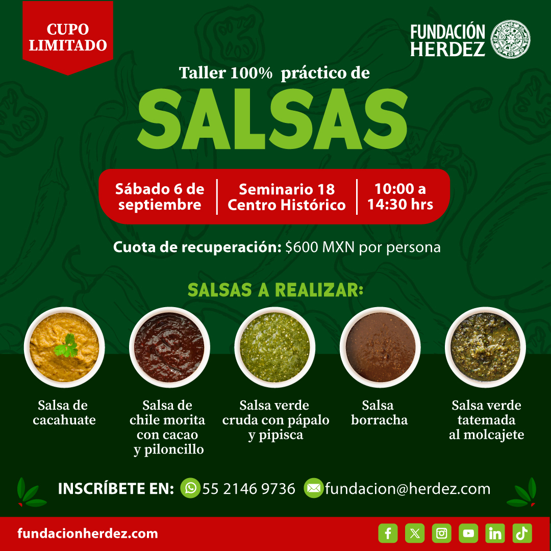 Taller de salsas Aprende cómo hacer salsa: Salsa de cacahuate Salsa de chile morita con cacao y piloncillo Salsa verde cruda con pápalo y pipisca Salsa borracha Salsa verde tatemada al molcajete + Añadir Google Calendar Exportación + iCal / Outlook Fecha Sep 06 2025 Finalizdo! Hora 10:00 - 14:30 Costo MXN600.00 Localización Fundación Herdez Categoría TALLER Organizador Fundación Herdez Compartir este evento