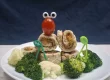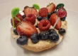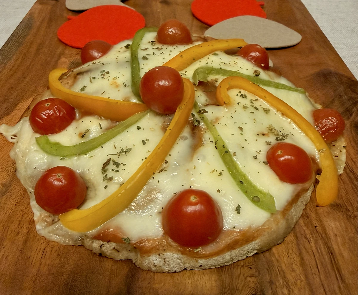 Distribuir los tomates cherry y los pimientos sobre el queso. Espolvorear orégano al gusto.