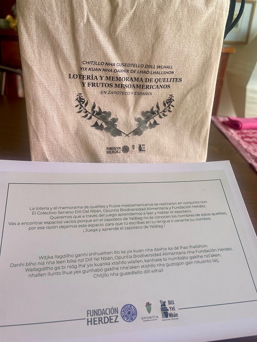 El colectivo Dill Yel Nbán, Opuntia Biodiversidad Alimentaria y Fundación Herdez presentaron la Lotería y memorama de quelites y frutos mesoamericanos en zapoteco de Yalálag, materiales educativos ilustrados que incorporan vocabulario local y promueven el reconocimiento de esta variante lingüística, la cual cuenta con un número reducido de hablantes entre la población joven. Las piezas constan de un juego de lotería y un juego de memorama acompañado de ilustraciones botánicas sobre quelites y frutos que crecen en la comunidad de Villa Hidalgo Yalálag y se consumen en diferentes pueblos.